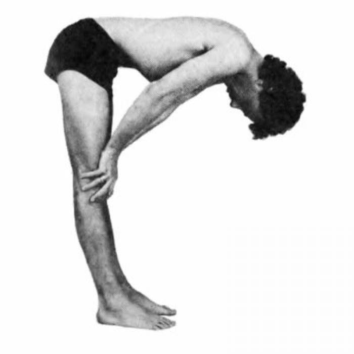 Сделайте медленный глубокий вдох, а на выдохе наклонитесь вниз и обопритесь руками о колени. Оставаясь в этой позе, полностью выдохните весь воздух из легкмх, одновременно, как можно сильнее втягивая живот.