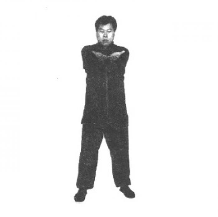 3. Плавно переместить руки вперед, концентрируя внимание на ладонях, а затем снова развести их в стороны. Тело при этом немного подается за руками. Повторить 8 раз.