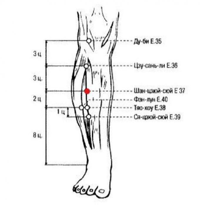 2. Ножной ян-мин канал желудка наружно-внутренне связан с ножным тай-инь каналом селезенки. Важной функцией точки Шан-цзюй-сюй Е.37 является содействие селезенке при недостатке Ци селезенки и желудка.