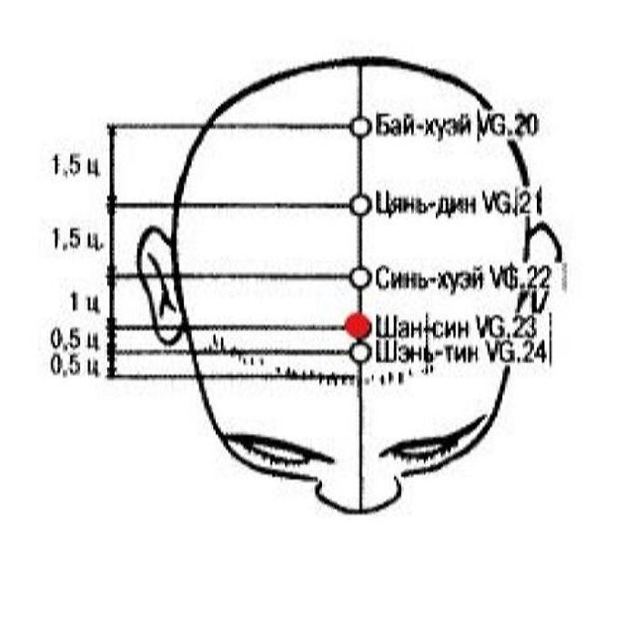 1. Шан-син VG.23 расположена на голове, является локальной точкой лечения некоторых болезней головы. Наибольшую эффективность точка проявляет при лечении различных болезней носа. Это объясняется тем, что сосуд Ду-май, к которому она относится, проходит через нос. Кроме того, ветви сосуда Ду-май проходят через подглазничную область и внутренний угол глаза, поэтому в древних источниках говорится об эффективности использования точки Шан-син VG.23 при лечении некоторых болезней глаз.