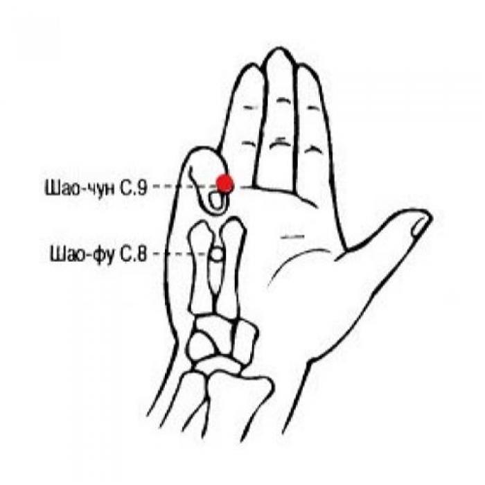 1. Шao-чун С.9 — точка-исток ручного шао-инь канала сердца, может использоваться при лечении основных болезней сердца — сердцебиения и боли в области сердца.