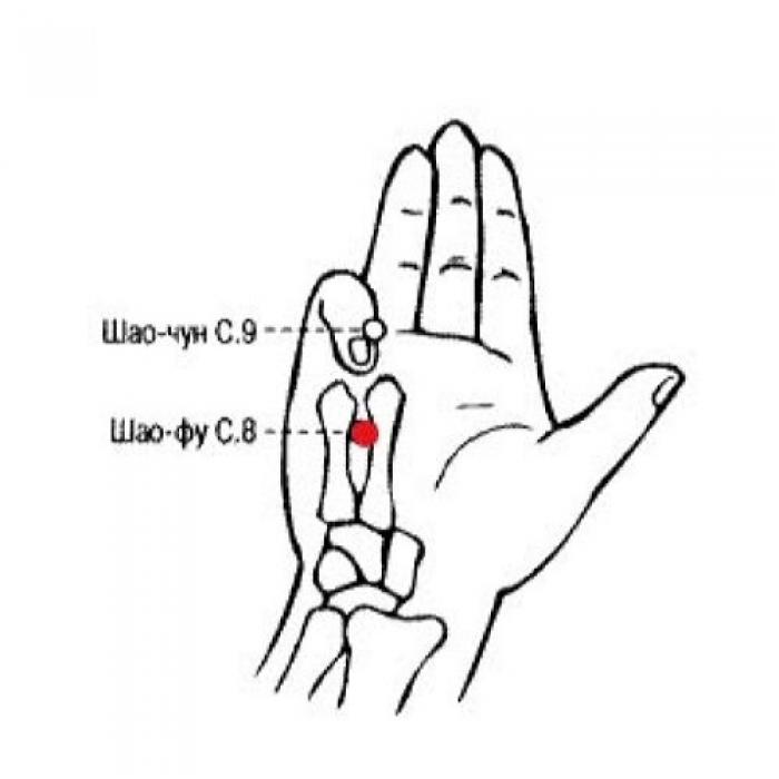 1. Шао-фу С.8 — точка-ручей ручного шао-инь канала сердца. Сердце относится к элементу Огонь, точки-ручьи цзан-органов также относятся к элементу Огонь, поэтому Шао-фу С.8 можно назвать «точкой-Огнем канала-Огня» или «Огнем в Огне», что является признаком высокой эффективности точки в лечении болезней из-за возгорания огня сердца. В каноне «Нань цзин» (Канон трудностей) также говорится, что точки-ручьи всех двенадцати каналов обычно используются при лечении болезней со свойствами огня и жара. Таким образом, основной функцией точки Шао-фу С.8 является охлаждение огня сердца. При повреждении сердца огнем становится неспокойным жизненный дух Шэнь, возникают раздражительность и бессонница. Огонь сердца также повреждает жидкости тела, могут возникнуть жажда и затрудненное мочеиспускание. При лечении этих болезней можно использовать точку Шао-фу С.8.