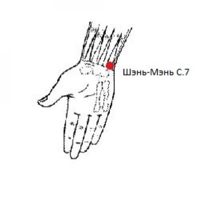 2. Шэнь-мэнь С.7 — точка первичной Ци и точка-быстрина ручного шао-инь канала сердца. Эта точка считается самой важной точкой этого канала, одной из ключевых точек лечения болезней сердца. Ее можно использовать при разнообразных состояниях, связанных с нарушением функций сердца, таких как недостаток Ци сердца, недостаток Ян сердца, недостаток крови сердца, недостаток Инь сердца, застой крови сердца, возгорание огня сердца. Чаще всего точку рекомендуется использовать при боли в области сердца и сердцебиении, которые могут сопровождать все указанные состояния.