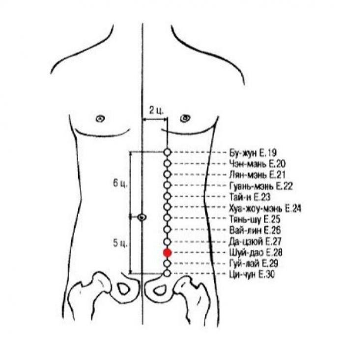 2. Точка Шуй-дао Е.28 расположена на 2 цуня кнаружи от точки Гуань-юань VC.4 — му-точки живота тонкого кишечника, одной из самых эффективных точек, способствующих укреплению Ян, восполнению первичной Ци, нормализации функций сосудов Чун-май и Жэнь-май. Кроме того, точка Шуй-дао Е.28 относится к ножному ян-мин каналу желудка, который через точку Ци-чун Е.30 связывается с сосудом Чун-май — одним из «сосудов матки». Таким образом, точку Шуй-дао Е.28 можно использовать при различных нарушениях в сосудах Чун-май и Жэнь-май.