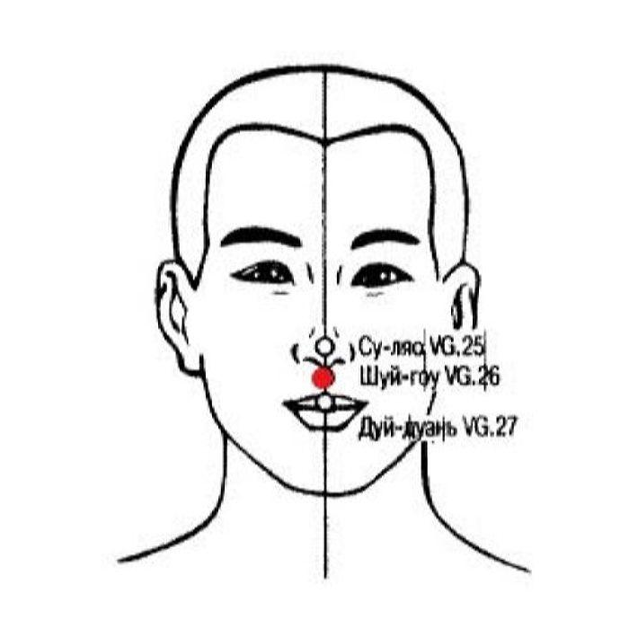 4. Шуй-гоу VG.26 — точка пересечения сосуда Ду-май, ручного ян-мин канала толстого кишечника и ножного ян-мин канала желудка, поэтому может использоваться при лечении некоторых локальных болезней, связанных с местами прохождения указанных каналов.