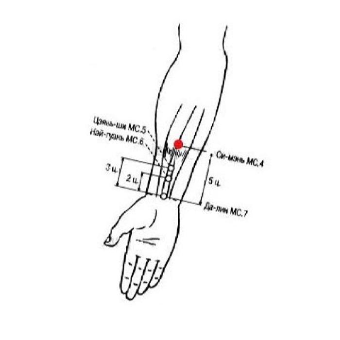 3. Си-мэнь МС.4 — точка-щель ручного цзюэ-инь канала перикарда, способствует охлаждению жара в крови, чем объясняется ее использование при фурункулезе, возникающем при скоплении огня-токсина.
