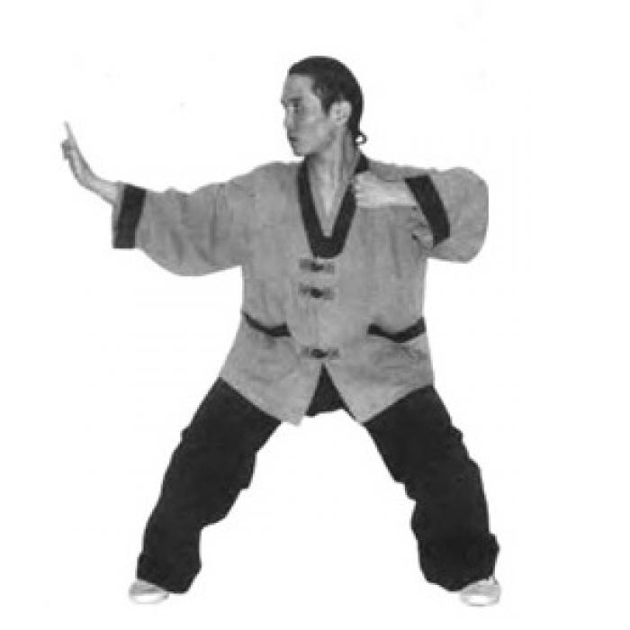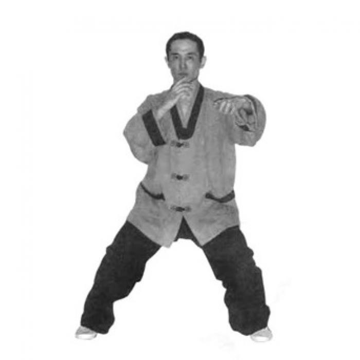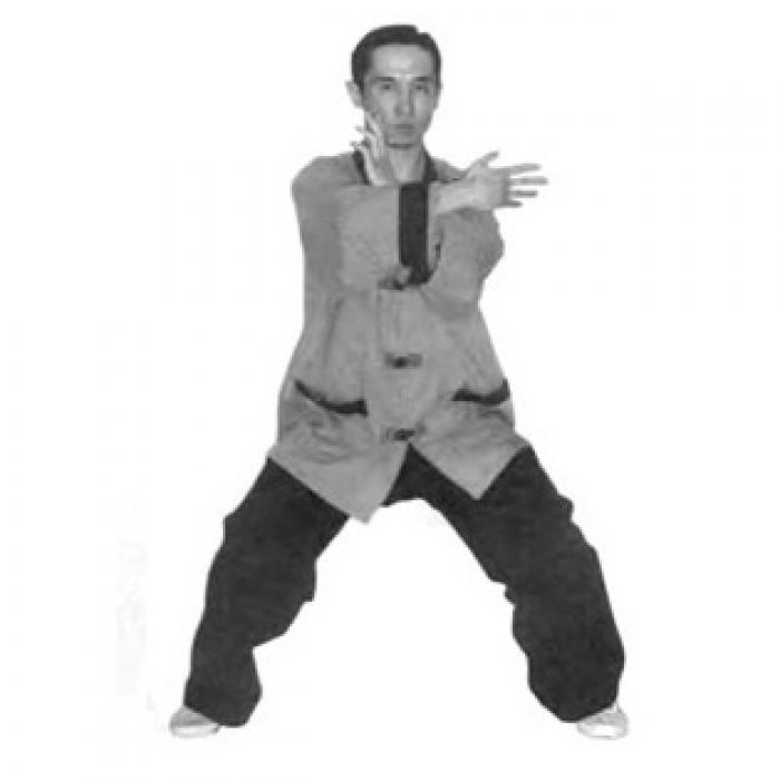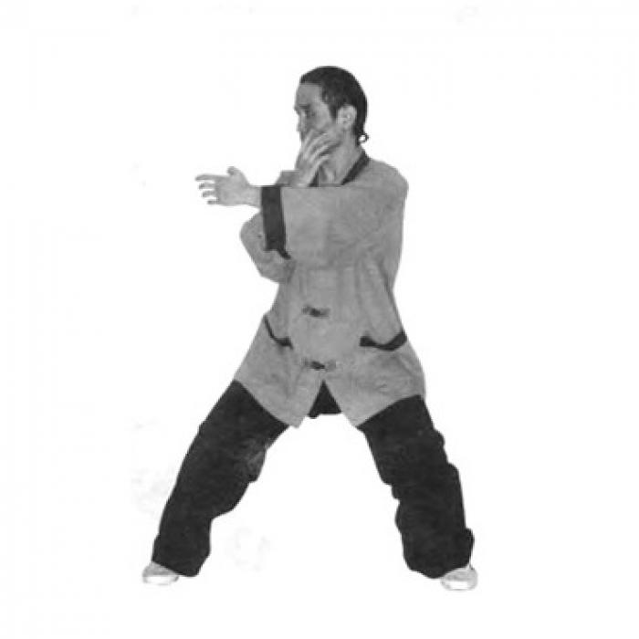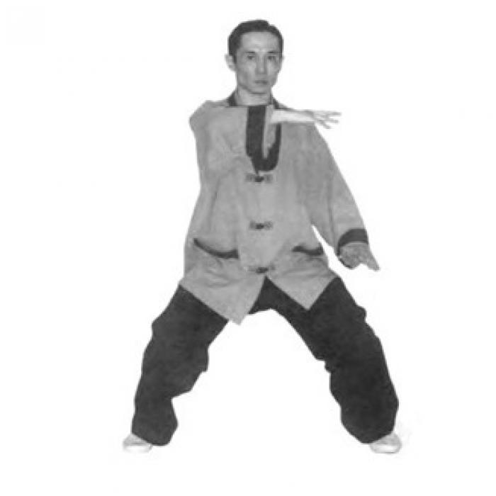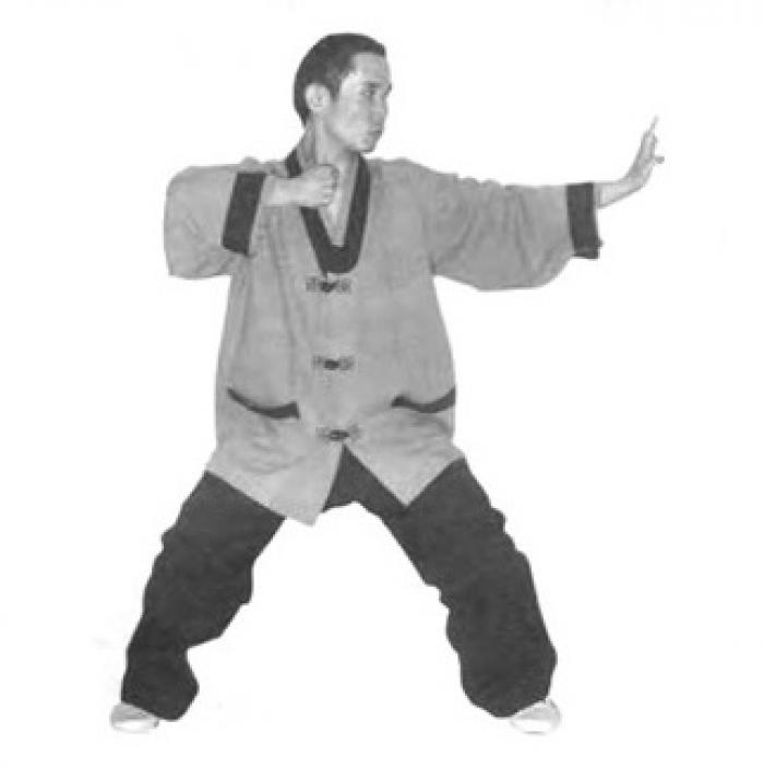 Выполните шаг влево левой ногой, согните колени и опуститесь в «позу всадника» (мабу). Расстояние между стопами две ширины плеч. Одновременно с шагом разверните ладони внутренней стороной вниз и разведите руки в стороны до положения около бедер. Руки слегка согнуты в локтевых суставах, пальцы рук направлены вперед и чуть вовнутрь. Сидя в «позе всадника» слегка разверните корпус в пояснице влево, не меняя положения ног. Вслед за поворотом корпуса переведите правую руку снизу через сторону до положения перед собой. Локоть правой руки слегка согнут. Одновременно, сгибая левую руку в локтевом суставе, переведите ее снизу-вверх до положения перед правой рукой. Ладонь правой руки направлена к корпусу, ладонь левой руки от себя. Не останавливая движение, одновременно сожмите ладонь правой руки в кулак и выполните движение правым локтем вправо в сторону, ладонь левой руки переведите в положение так, как показано на фото и выполните движение левой рукой влево в сторону, выпрямляя ее в локтевом суставе. Одновременно с движением левой руки поверните голову влево, взгляд должен быть направлен влево-вперед.