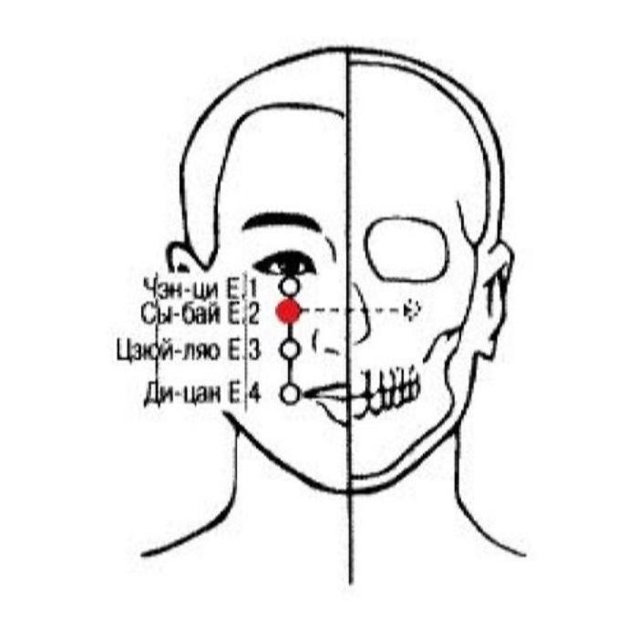 2. Точка Сы-бай Е.2 расположена на лице, является локальной точкой лечения различных заболеваний головы и лица.