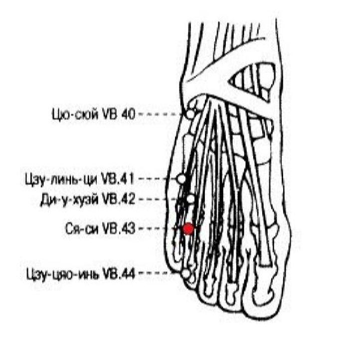 Ся-си VB.43 - точка-ручей ножного шао-ян канала желчного пузыря, относится к элементу Вода. В каноне «Нань цзин» (Канон трудностей) говорится, что точки-ручьи обычно применяются при лечении болезней со свойствами жара. Ножной шао-ян канал желчного пузыря, к которому относится точка Ся-си VB.43, имеет наружно-внутреннюю взаимосвязь с ножным цзюэ-инь каналом печени. Чаще всего точка используется при возгорании огня печени, а также при возгорании огня печени и желчного пузыря. Кроме того, точку можно использовать при боли в подреберье, мастите, аменорее, дисменорее, вызванных застоем Ци печени.