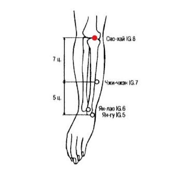 Название: «сяо» - «тонкий [кишечник]»; «хай» — «море». Сяо-хай IG.8 — точка-устье ручного тай-ян канала тонкого кишечника. Достигая этой точки канальная Ци становится обильной, подобно реке, впадающей в море.