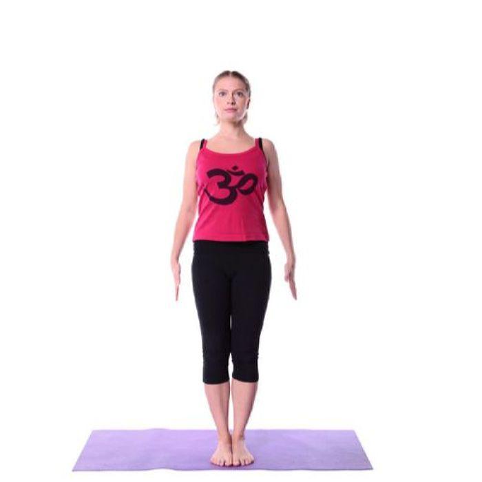 Встаньте, поставьте стопы рядом, чтобы большие пальцы ног, пятки и косточки щиколоток соприкасались. Распределите вес тела равномерно на стопах, сохраняя параллельность внутренних поверхностей стоп.