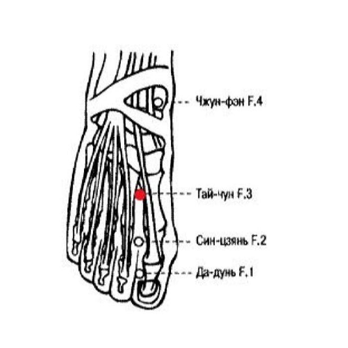 3. Тай-чун F.3 — точка ножного цзюэ-инь канала печени. Печень открывается в глаза. При нарушении функций печени возникают различные болезни глаз, для лечения которых можно использовать точку Тай-чун F.3.