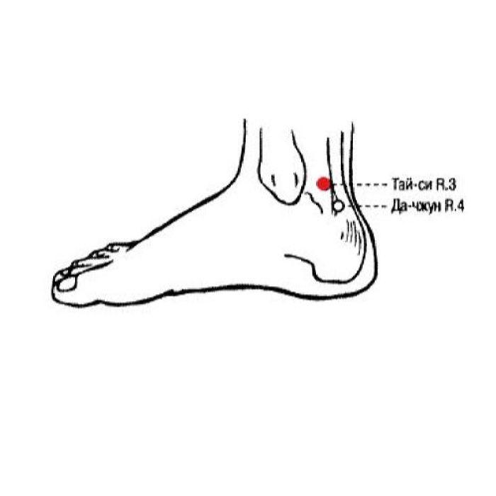 3. Важной функцией точки Тай-си R.3 является нормализация состояния сосудов Чун-май и Жэнь-май. Эти сосуды относятся к «сосудам матки», источником их функциональной активности является Ци почек. Точка может применяться при дисменорее и маточных кровотечениях, связанных с нарушениями в «сосудах матки».