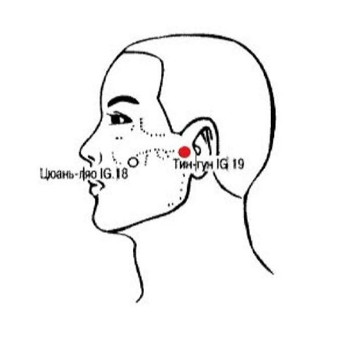 Функции: точка Тин-гун IG.19 расположена возле уха, относится к ручному тай-ян каналу тонкого кишечника. Среди болезней этого канала особо выделяются снижение слуха и глухота. Кроме того, Тин-гун IG.19 — точка пересечения ручного тай-ян канала тонкого кишечника, ручного шао-ян канала Сань-цзяо и ножного шао-ян канала желчного пузыря. Ветвь канала желчного пузыря от заушной области входит в ухо, выходит на поверхность перед ухом. Ветвь канала Сань-цзяо от подушной области также входит в ухо и выходит на поверхность в точке Тин-гун IG.19. На связь с ушами указывает и название точки — «дворец слуха». Таким образом, точка Тин-гун IG.19 — одна из важнейших точек лечения различных болезней уха.