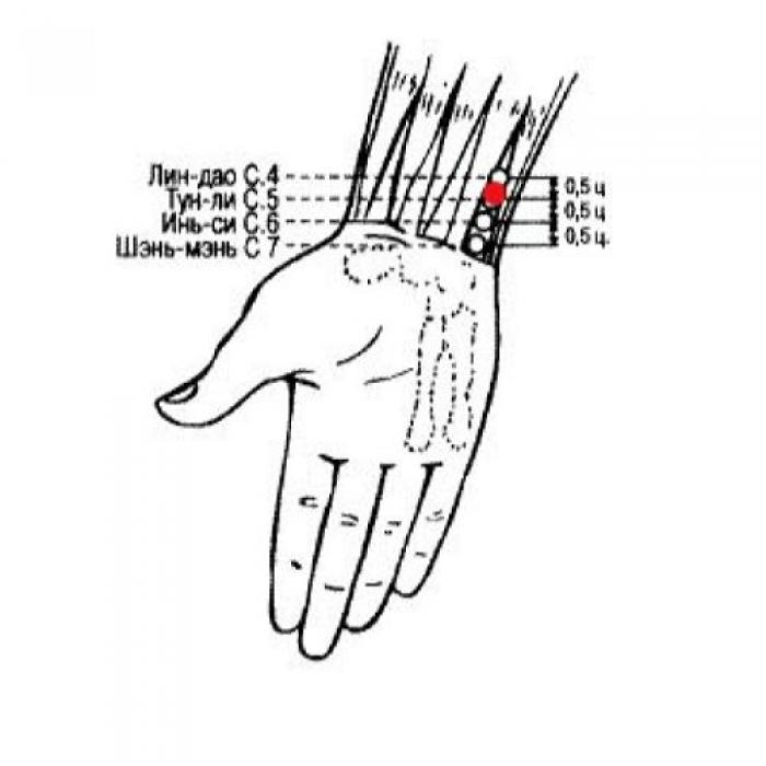 3. Точка Тун-ли С.5 относится к ручному шао-инь каналу сердца, следовательно, ее можно использовать при различных болезнях сердца и расстройствах жизненного духа Шэнь, который хранится в сердце. Точка применяется при боли в области сердца, ощущении сдавленности грудной клетки, упадке сил и сердцебиении, подавленности настроения, сонливости, нежелании разговаривать, маниакальном состоянии, эпилепсии.
