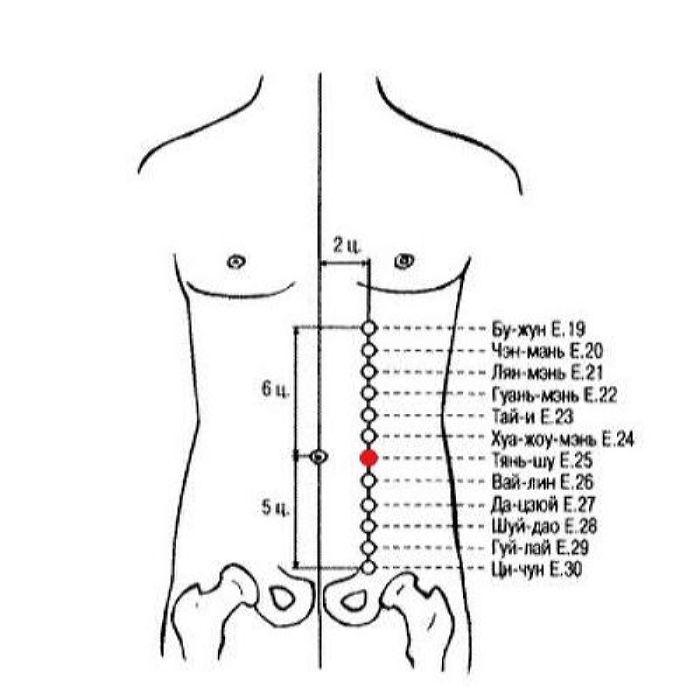 1. Точка Тянь-шу Е.25 относится к ножному ян-мин каналу желудка, является му-точкой живота толстого кишечника, имеет важное значение при лечении разнообразных заболеваний желудка