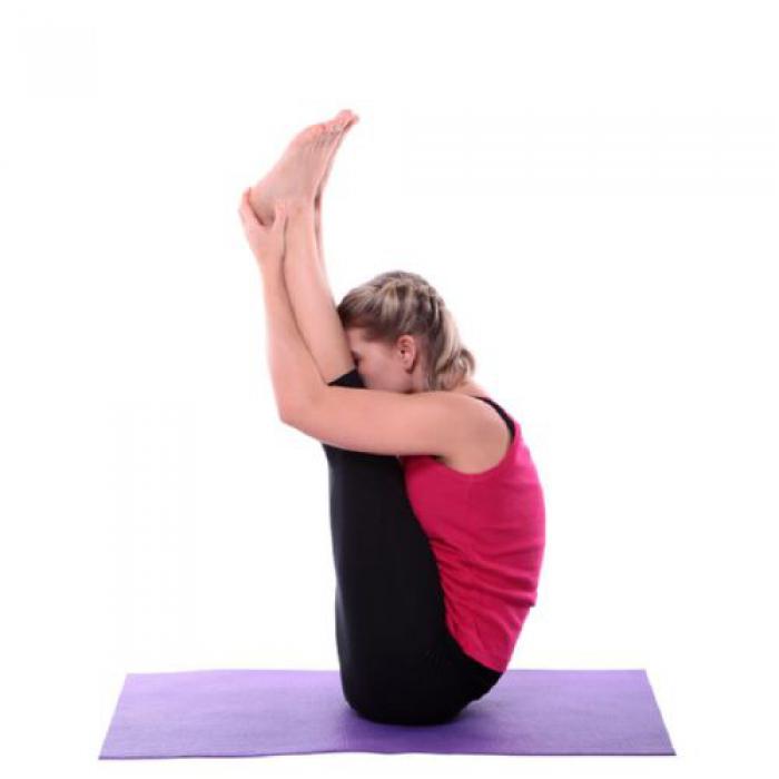 Освоившись в этом положении, переплетите пальцы рук за стопами и балансируйте. Затем, не меняя положения ног, приведите к ним голову и корпус, удлините шею вверх и на выдохе опустите лоб на колени. Максимально вытяните вверх ноги и позвоночник. Оставайтесь в позе около 30 секунд. Дышите в нормальном ритме.