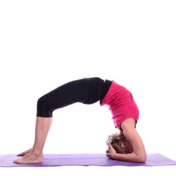 На выдохе поднимите тело вверх, упираясь на руки и на ноги. Поднимать тело следует до тех пор, пока голова не станет свободно свисать вниз. Хорошо прогнитесь в позвоночнике.