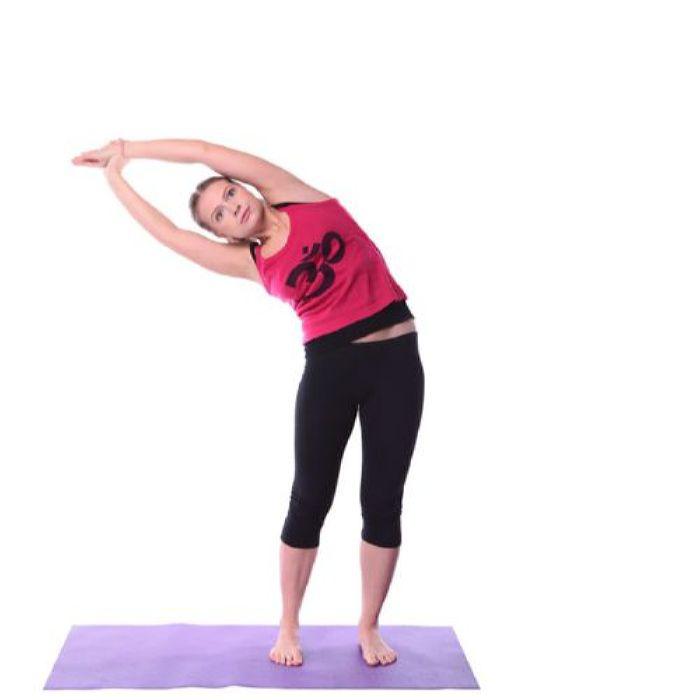 Затем сделайте полный вдох, вытягивая туловище и руку и вернитесь в вертикальное положение. При выдохе опустите руку вниз в исходное положение. Повторите асану в правую сторону.