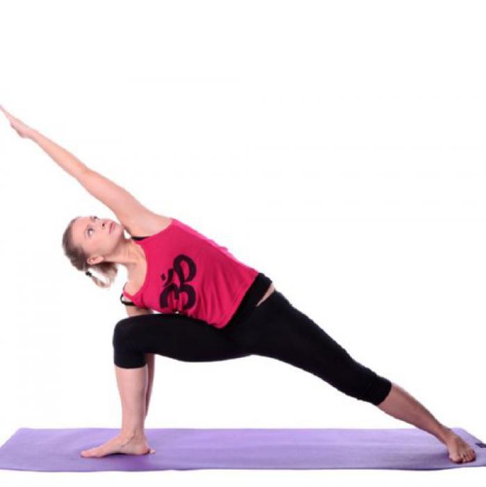 Рука, поднятая вверх, должна указывать на потолок, так как это поможет раскрыть грудную клетку и держать ее поднятой. Убедитесь в том, что ваша правая нога сзади повернута вовнутрь на 15 градусов, а ее подъем находится на одной линии с пяткой другой ноги.