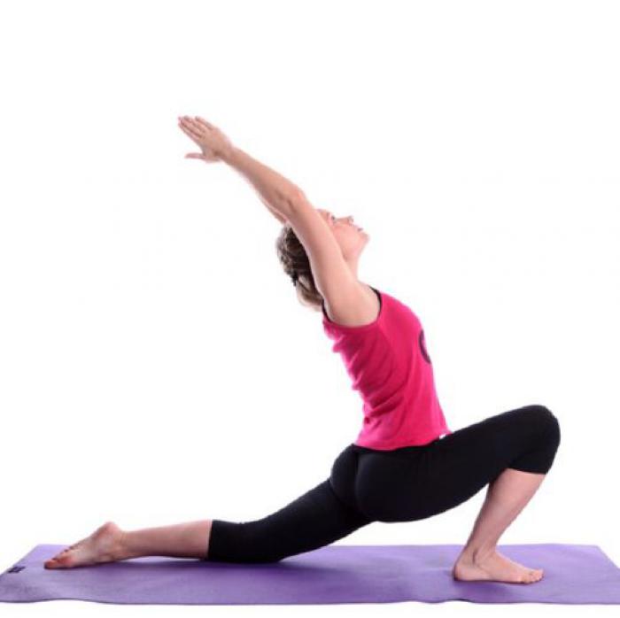 Правую ногу вытяните назад как можно дальше, а левую ногу согните в колене.