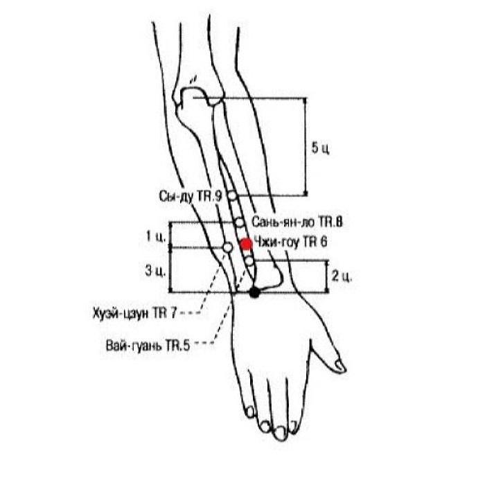 1. Вай-гуань TR.5 — точка коллатерали ручного шао-ян канала Сань-цзяо. В каноне «Лин шу» говорится: