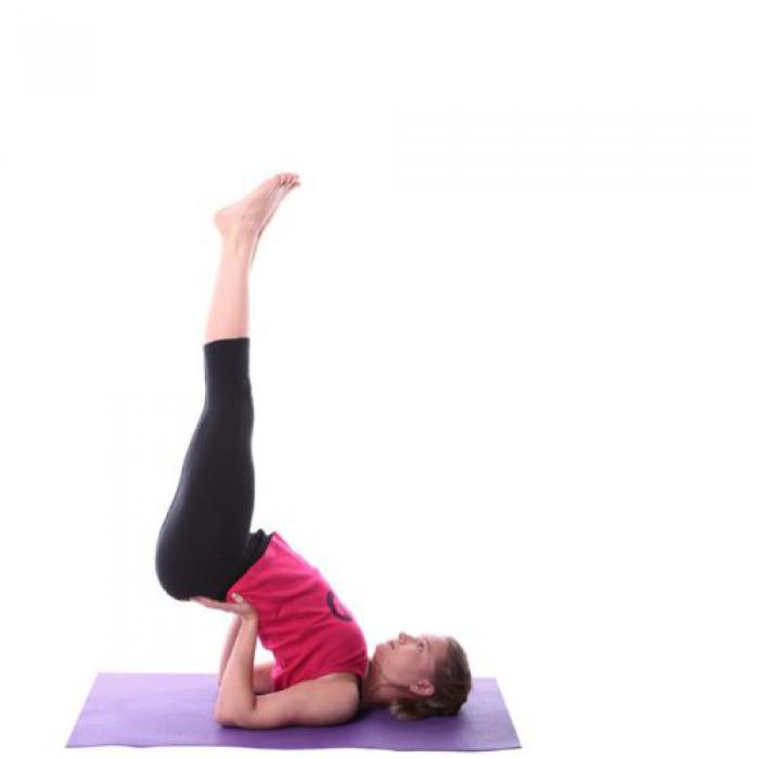 Подхватить поясницу руками, поставить на пол локти. Удерживая тело на руках, выпрямить туловище. Голова лежит на полу, спина прямая, ноги вытянуты вертикально вверх.