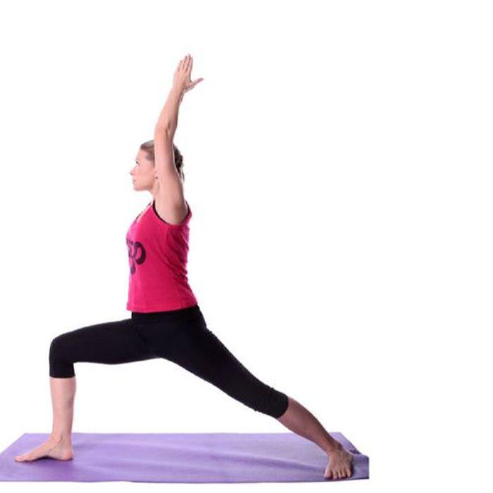 Выдохните и согните левую ногу в колене под углом 90 градусов. Потяните торс вверх, как будто его отделяют от бедер. Сведите лопатки вместе, чтобы раскрыть грудную клетку. Поднимите подбородок к потолку, посмотрите вверх. Правая нога должна быть полностью растянута. Бедра, плечи и торс должны поворачиваться влево. Задержитесь на 20—30 секунд, вдохните, выпрямитесь и опустите руки.