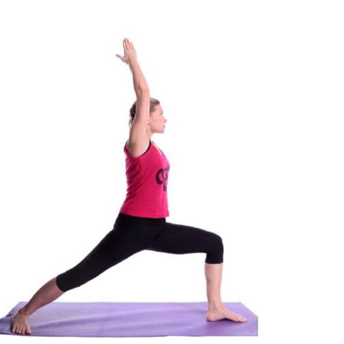 Выдохните и согните левую ногу в колене под углом 90 градусов. Потяните торс вверх, как будто его отделяют от бедер. Сведите лопатки вместе, чтобы раскрыть грудную клетку. Поднимите подбородок к потолку, посмотрите вверх. Правая нога должна быть полностью растянута. Бедра, плечи и торс должны поворачиваться влево. Задержитесь на 20—30 секунд, вдохните, выпрямитесь и опустите руки.