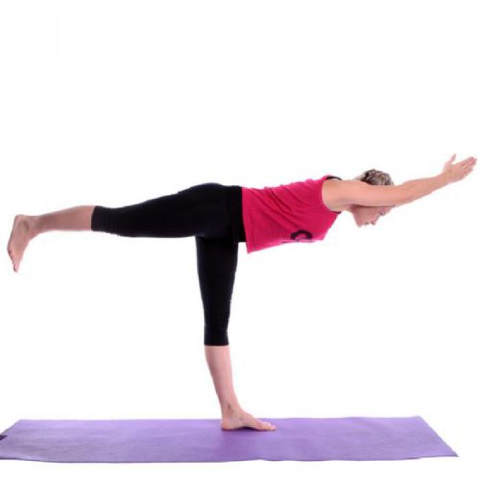 Вытяните корпус еще дальше вперед, выпрямите левую ногу и поднимите правую ногу так, чтобы она была параллельна полу. Правая нога, туловище, голова и руки параллельны полу. Вытяните пальцы в стороны и разверните чуть в сторону пятку правой ноги.