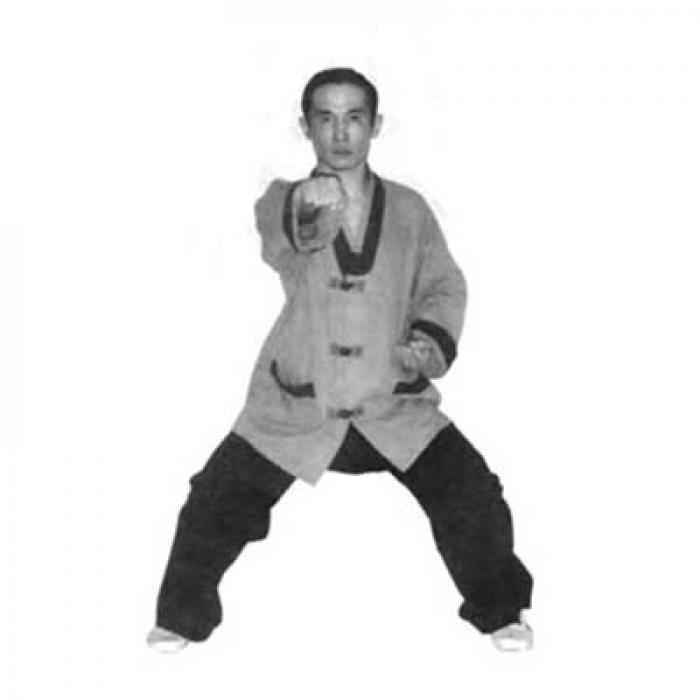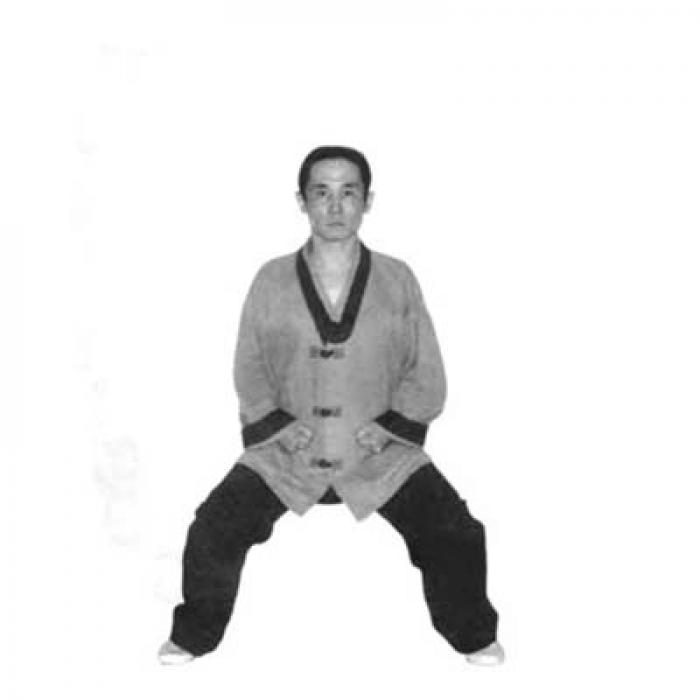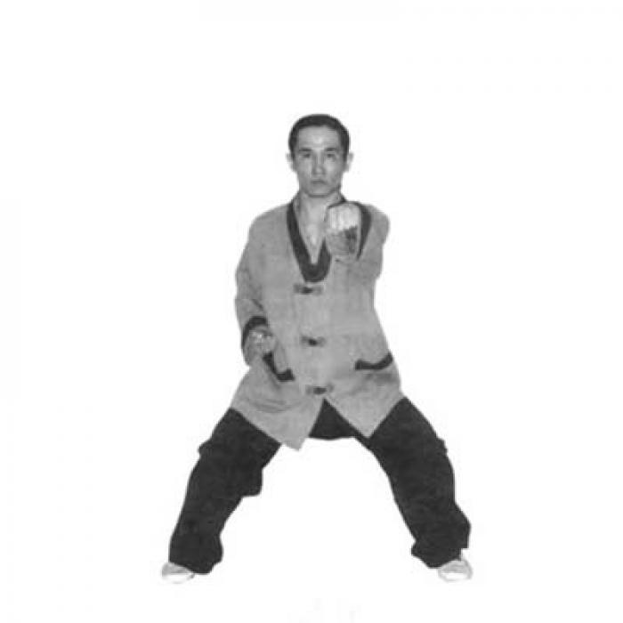 Выполните шаг влево левой ногой, согните колени и примите «позу всадника». Одновременно с шагом сожмите ладони в кулаки и сгибая руки в локтевом суставе, расположите кулаки на уровне нижней области живота. Из этого положения выполните левой рукой прямой удар кулаком вперед. Правая рука остается в исходном положении. Затем верните левую руку в положение около поясницы и выполните прямой удар кулаком вперед правой рукой. Чтобы вернуться в исходное положение выпрямите колени, приставьте левую ногу на шаг к правой, руки свободно опустите вдоль бедер.