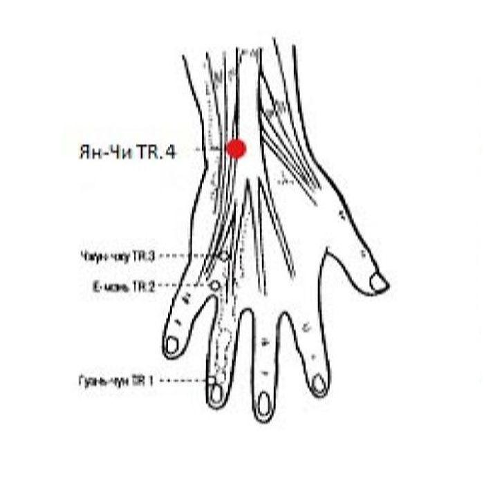 1. Основной функцией точки Ян-чи TR.4 является «распрямление сухожилий». Точка чаще всего используется при лечении локальных нарушений в области запястья.