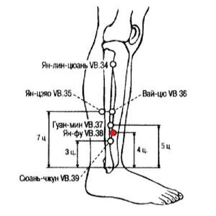 1. Ножной шао-ян канал желчного пузыря, к которому относится точка Ян-фу VB.38, имеет наружно-внутреннюю взаимосвязь с ножным цзюэ-инь каналом печени. Основной функцией точки является охлаждение печени и желчного пузыря, ее можно использовать при головокружении, горечи во рту, боли в подреберье и других нарушениях, вызванных возгоранием огня печени и желчного пузыря.