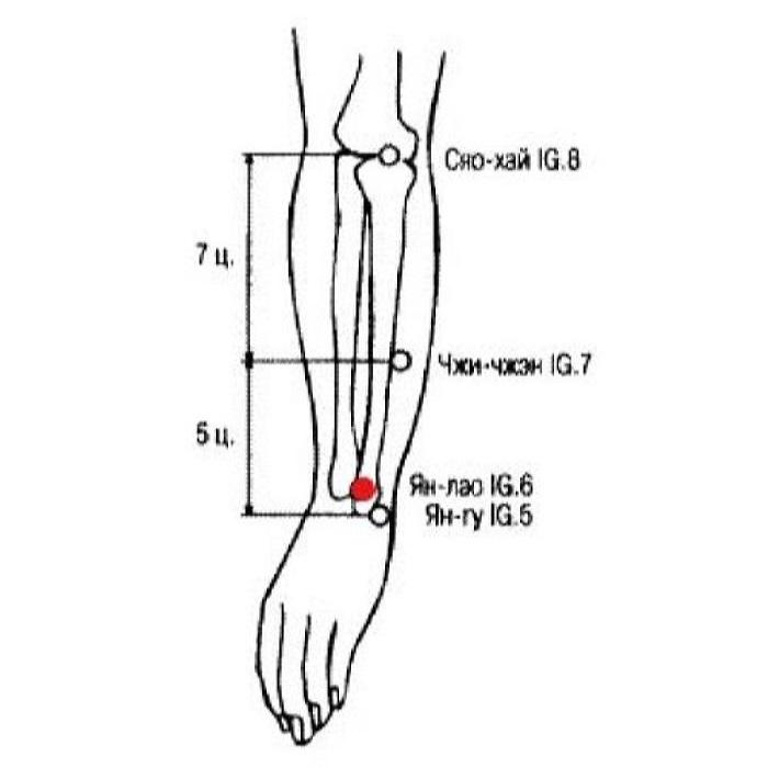 2. Ян-лао IG.6 — точка-щель ручного тай-ян канала тонкого кишечника. Патологические изменения в определенном цзанфу-органе часто отражаются на точке-щели соответствующего канала, поэтому пальпация этой точки имеет определенное значение в диагностике. Кроме того, точки-щели Ян-каналов часто используются при лечении болезней с острой болью, чем объясняется использование точки Ян-лао IG.6 при лечении боли по ходу канала на верхней конечности.