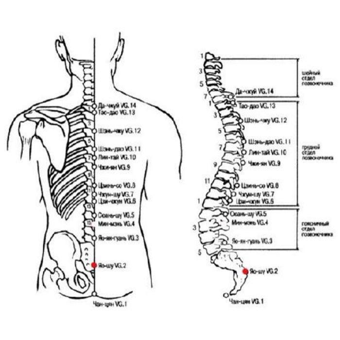 Яо-шу VG.2 - точка сосуда Ду-май, расположена в области крестца, является локальной точкой лечения некоторых болезней мочеполовой системы и заднего прохода.