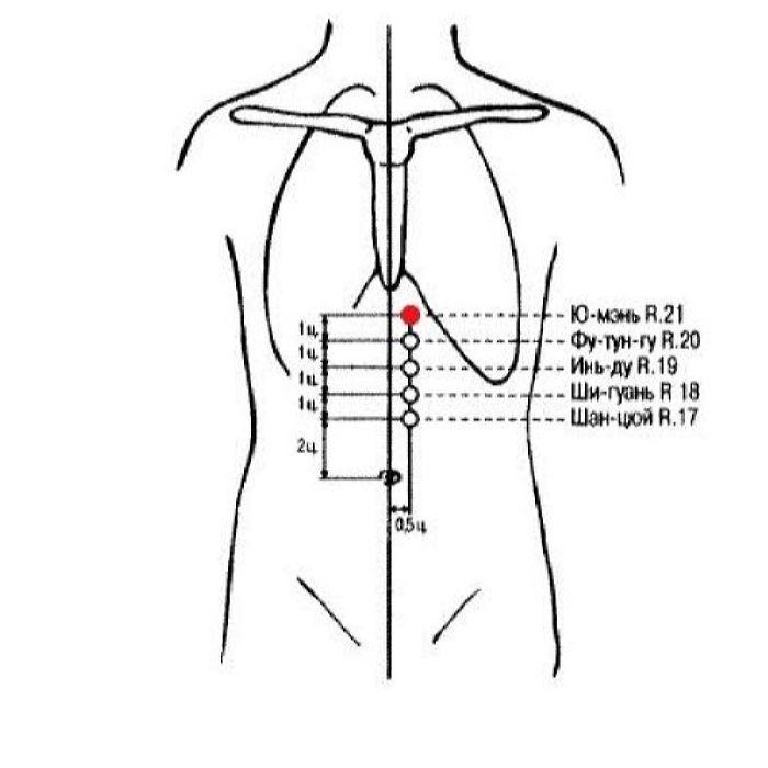 Ю-мэнь R.21 — точка ножного шао-инь канала почек, расположена в эпигастральной области, является локальной точкой лечения нарушений пищеварения.