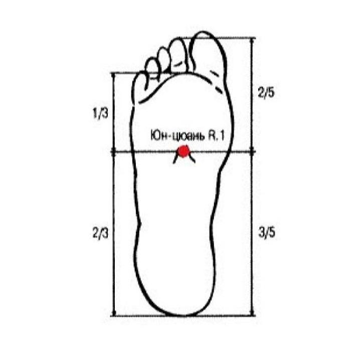 Локализация: в середине подошвы, между II и III плюсневыми костями, в углублении, образующемся при поджатии пальцев стопы, на 1/3 расстояния от основания II - III пальцев до заднего края пятки, на 2/5 расстояния от кончика II пальца до заднего края пятки.