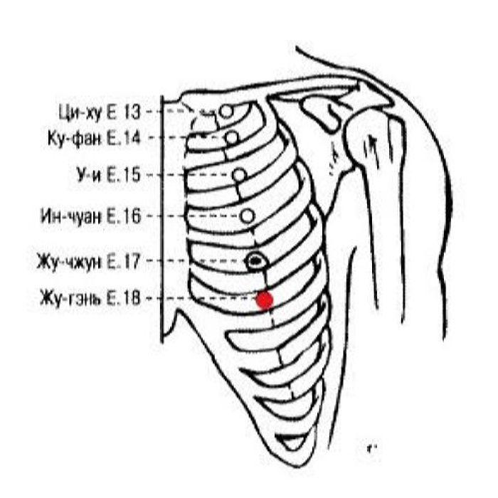1. Точка Жу-гэнь Е.18 расположена на грудной клетке, вблизи легких. Ножной ян-мин канал желудка, к которому относится точка, имеет наружно-внутреннюю связь с ножным тай-инь каналом селезенки. Селезенка управляет транспортировкой и трансформацией сырости, содействуя водному обмену. Нарушение этой функции селезенки обычно приводит к образованию патогенной флегмы, которая может скапливаться в легких. Флегма заваливает пути циркуляции Ци, повреждается Ци легких, возникают одышка и кашель с отхаркиванием большого количества мокроты, боль в грудной клетке. Земля (селезенка) порождает Металл (легкие). Восстановление функций селезенки способствует устранению патогенной флегмы, восполнению Ци легких. Этим объясняется использование точки Жу-гэнь Е.18 при лечении болезней легких.